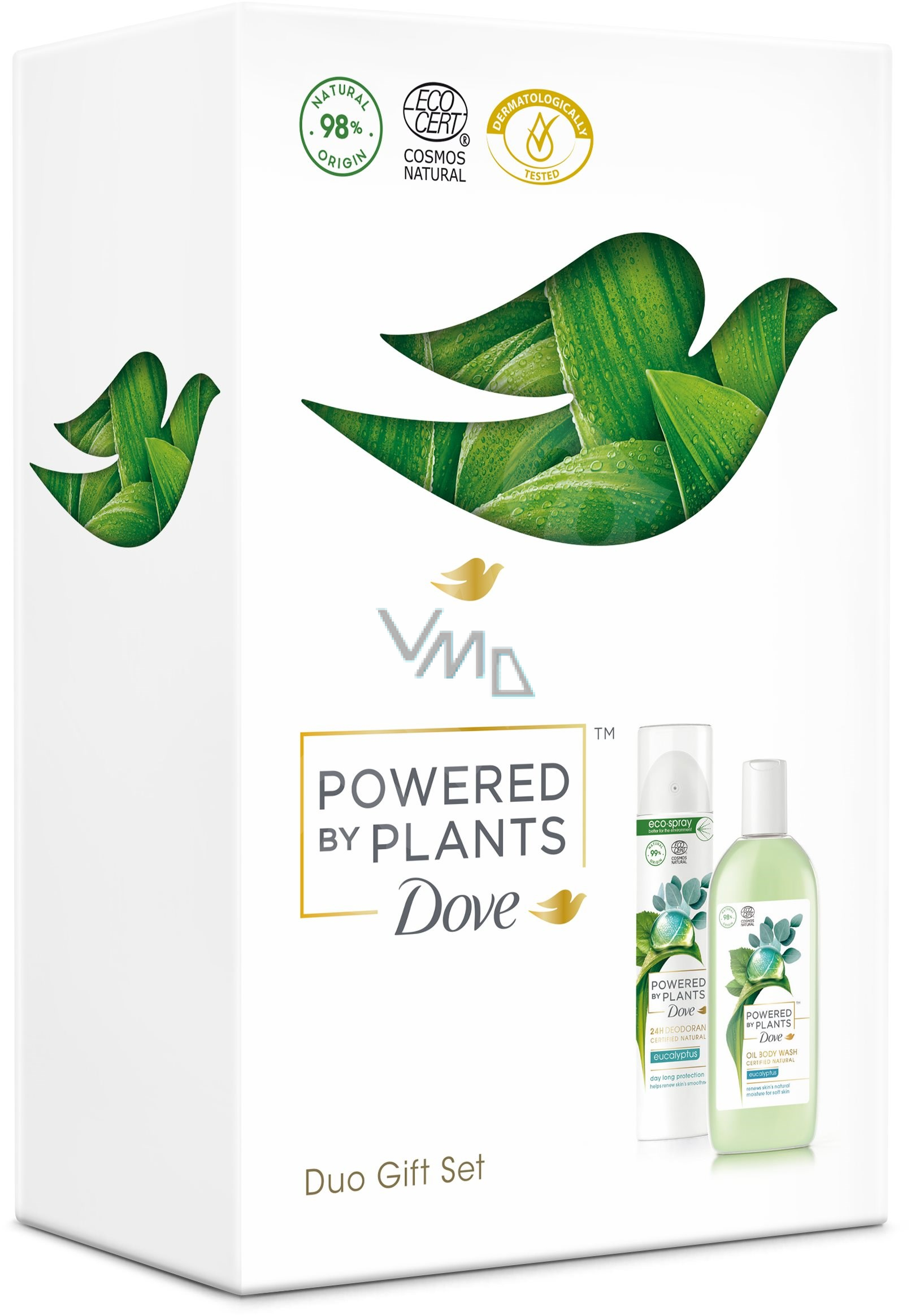 V kosmetické dárkové sadě Premium Inspired by Nature naleznete atraktivní přípravky přírodní a veganské tělové kosmetiky značky DOVE, které udělají radost jak ženě, tak muži. Hydratační sprchový gel DOVE Powered by Plants Eucalyptus mohou používat díky jeho příjemné vůni rostlinných složek i muži. Po jeho použití bude pokožka hydratovaná, vyživená a provoněná. Osvěžující deodorant neobsahuje žádné aluminiové soli, hnacím plynem je dusík a jeho vůně je přírodního původu. Podpaží nejen provoní, ale i hydratuje, vyživuje a zvláčňuje. Oba výrobky ze sady DOVE Premium Inspired by Nature se skvěle doplňují nejenom atraktivní přírodní vůní, ale i svými účinky.