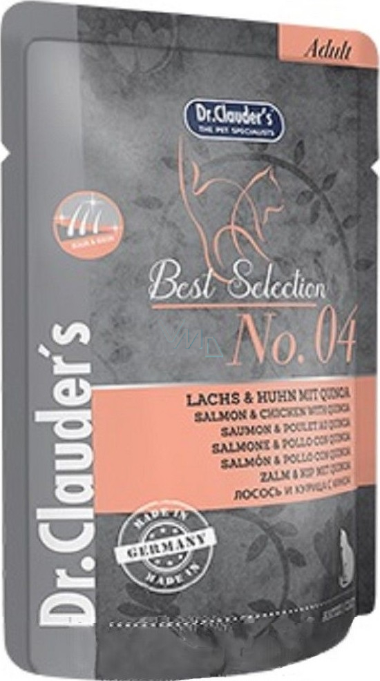 DR. Clauders Beste Auswahl Nr. 4 Hähnchen-, Lachs- und Quinoa-Komplettfutter mit Fleischstücken für Katzentaschen 85 g