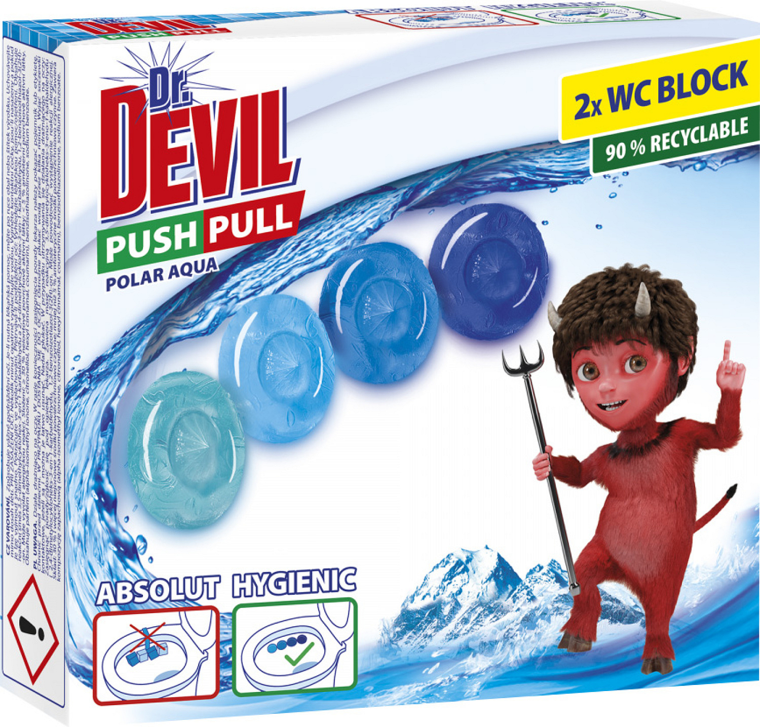 ABSOLUT HYGIEISCH - ohne einen Korb voller Bakterien, Viren und Schmutz, das ist Dr. DEVIL PUSH PULL GEL. Der erste WC-Hänger ohne Korb. Frisch duftend, reinigt und wirkt vorbeugend gegen die Ablagerung von Kalk.