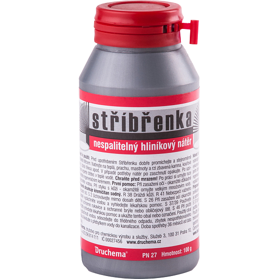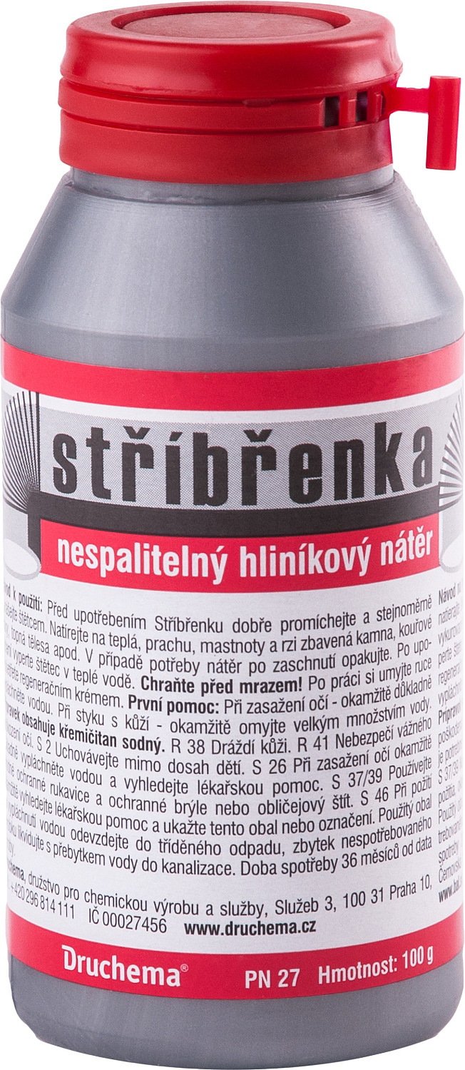 Druchema Stříbřenka feuerfeste Farbe dient für die Anstriche von Öfen, Heizkörpern und Schornsteinrohren. Nach dem Trocknen und Brennen entsteht eine helle, silbergraue matte Beschichtung. Stříbřenka ist nicht brennbar und nicht toxisch.