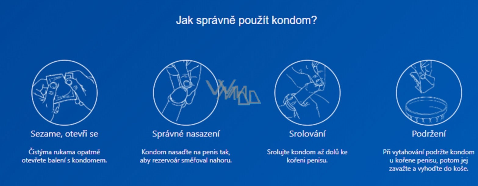 Vždy se řiďte instrukcemi uvedenými v letáčku, který najdete v krabičce s kondomy. Než kondom použijete, zkontrolujte datum spotřeby, uvedený na balíčku kondomu. Opatrně odtrhněte zoubkovanou stranu folie tak, abyste při tom nepoškodili vložený kondom. Opatrně ho vyjměte. Pozor na poškození kondomu nehtem nebo ostrými předměty; jako například prstenem či piercingem.