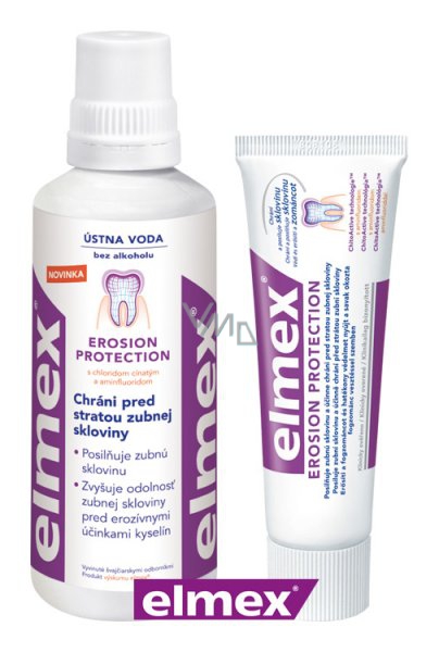 Ústní voda a zubní pasta elmex Erosion Protection s novou kombinací účinných složek chloridu cínatého a aminfluoridu vedou k tomu, že se na povrchu zubů vytvoří vrstva bohatá na cín. Tato vrstva bohatá na cín chrání vaše zuby před erozivním působením kyselin. Ionty cínu se začlení do postižené zubní skloviny, čímž se zvýší její odolnost vůči erozivním útokům. Tímto způsobem ústní voda elmex Erosion Protection účinně brání rozpouštění zubní skloviny. Aminfluorid navíc chrání před zubním kazem.