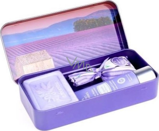 Esprit Provence Lavendel Toilettenseife 60 g + Duftbeutel + Handcreme 30 ml + Blechdose mit Bild des Sonnenuntergangs, Kosmetikset für Damen