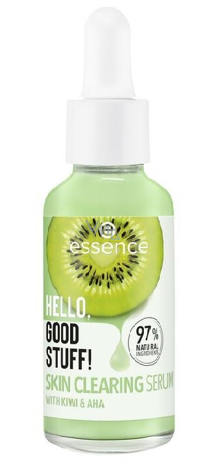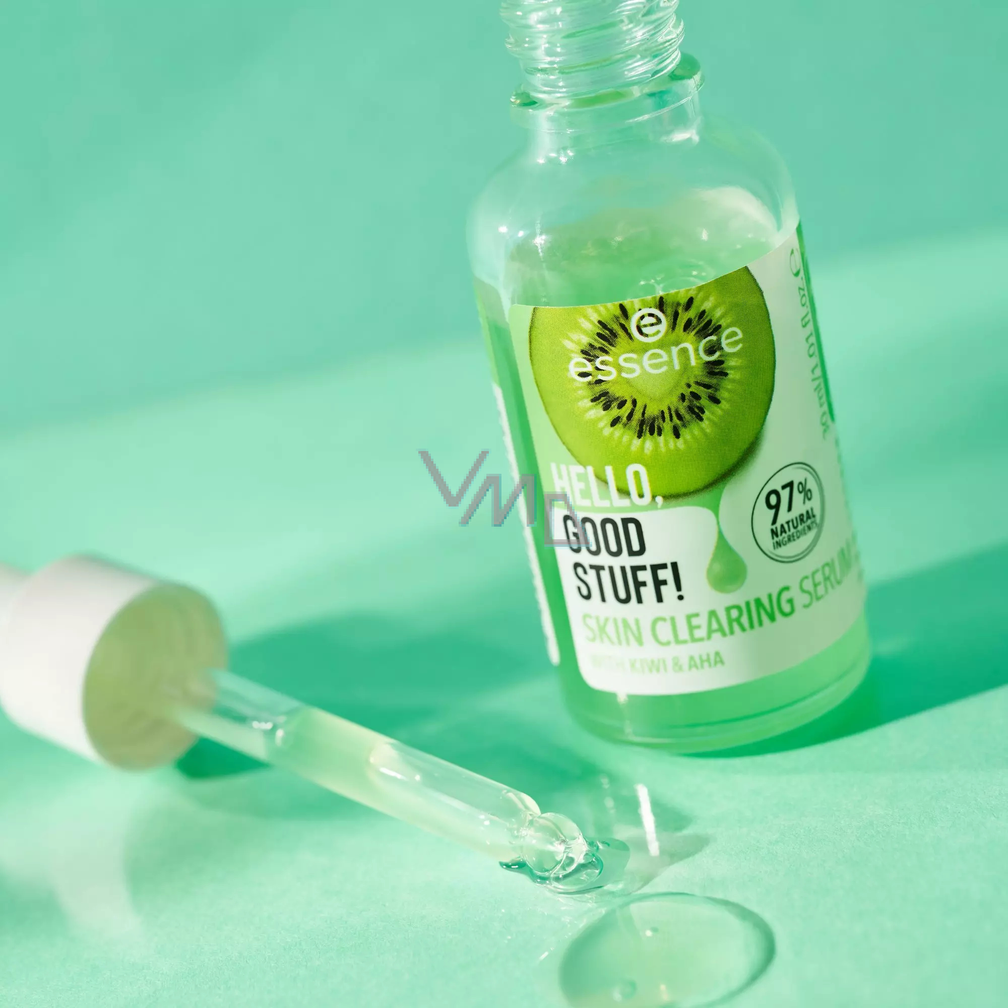 HELLO, GOOD STUFF! Serum CLEAR SKIN enthält AHA-Säuren für eine sanfte Peelingwirkung, Kiwiwasser und pflegendes Panthenol. Die Formel besteht zu 97 % aus natürlichen Inhaltsstoffen und die Haut fühlt sich dadurch außergewöhnlich weich an.