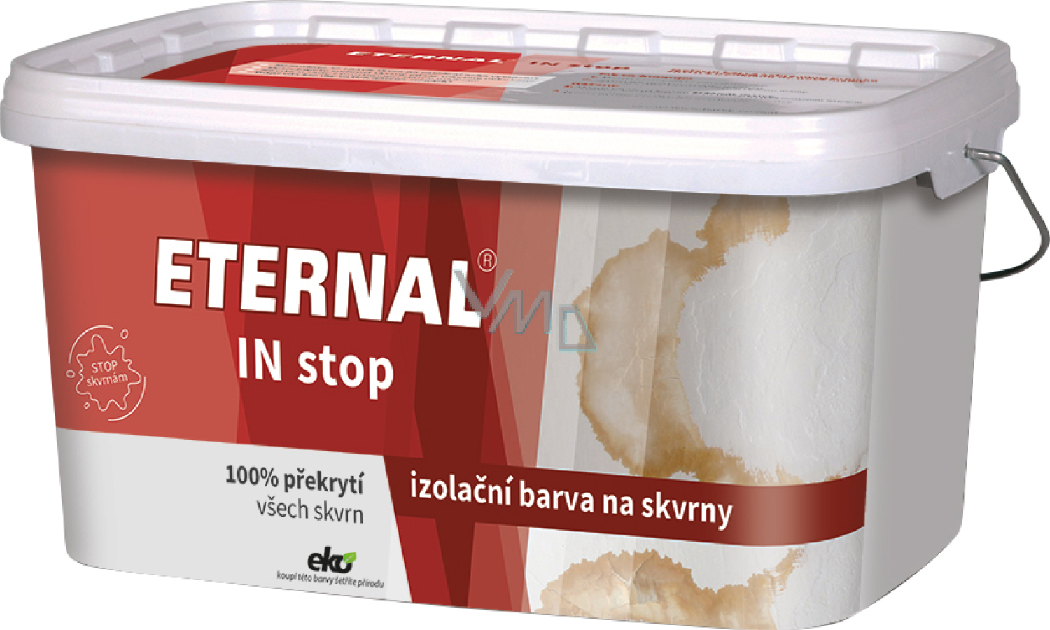 ETERNAL IN stop wird für Grundanstriche verwendet, mit denen der Durchtritt von Nikotinflecken in stark verrauchten Räumen in den neuen Anstrich verhindert werden kann. Weiterhin können mit diesem Anstrich Flecken von alten Rollanstrichen, Flecken durch Eindringen, Rost, Fett, Ruß, Flecken, die aus Holz, Spanplatten und Gipskartonplatten hervortreten, bei Anstrichen mit Dispersionsfarben usw. isoliert werden. ETERNAL IN stop zeichnet sich durch die Fähigkeit aus, das Eindringen von färbenden Stoffen aus dem Untergrund an die Oberfläche zu verhindern.