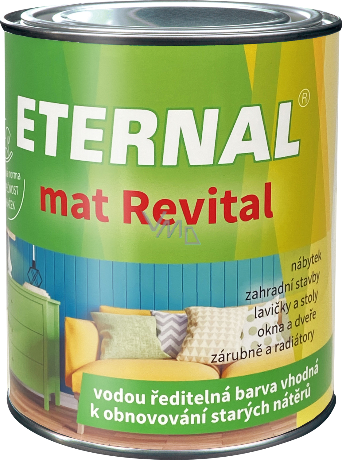 ETERNAL mat Revital ist ein universeller seidenmatter wasserverdünnbarer Anstrich für Innen- und Außenanwendungen, hergestellt aus einer speziellen netzbildenden Dispersion von Acrylatcopolymeren, Pigmenten, Füllstoffen und Additiven. Er bildet relativ harte, elastische matte Beschichtungen mit hoher Wetterbeständigkeit und ausgezeichneter Blockadebeständigkeit, auch bei höheren Temperaturen. Er zeichnet sich durch sehr gute Deckkraft, gute Fließfähigkeit, schnelles Trocknen und ausgezeichnete Haftung, auch auf alten synthetischen und ölbasierten Beschichtungen, aus. ETERNAL mat Revital erfüllt die Bedingungen der ČSN EN 71 Teil 3 Sicherheitsspielzeug Migration bestimmter Elemente.