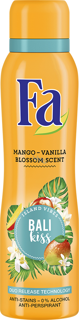 Objevte Fa Island Vibes Bali Kiss antiperspirant 150 ml s vůní manga a květu vanilky. Pro dlouhotrvající ochranu až 48 hodin. Bez alkoholu. S technologií dvojitého uvolnění. S efektem proti skvrnám.