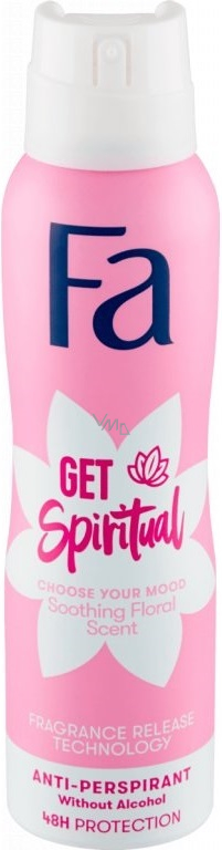 Fa antiperspirant sprej GET Spiritual se zklidňující květinovou vůní a technologií uvolňující vůni. Poskytuje 48hodinovou ochranu proti pocení a nepříjemnému zápachu. Fa antiperspirant sprej GET Spiritual je bez obsahu alkoholu.