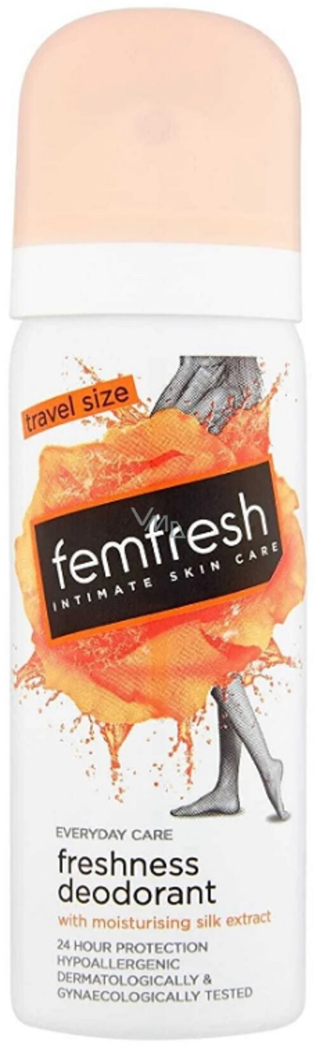 Deodorant Femfresh pro intimní hygienu pro ženy s hypoalergenním hedvábným sprejem. Jemný deodorant pro hygienu intimních partií má konzistenci lehké mlhy, která dokonale neutralizuje nepříjemné pachy a obklopí tělo jemným květinovým aroma. Jeho pečující složení nedráždí citlivé zóny a má také antibakteriální a dezinfekční vlastnosti, tonizuje a čistí. Přípravek poskytuje pocit dokonalé čistoty a svěžesti po mnoho hodin po použití.