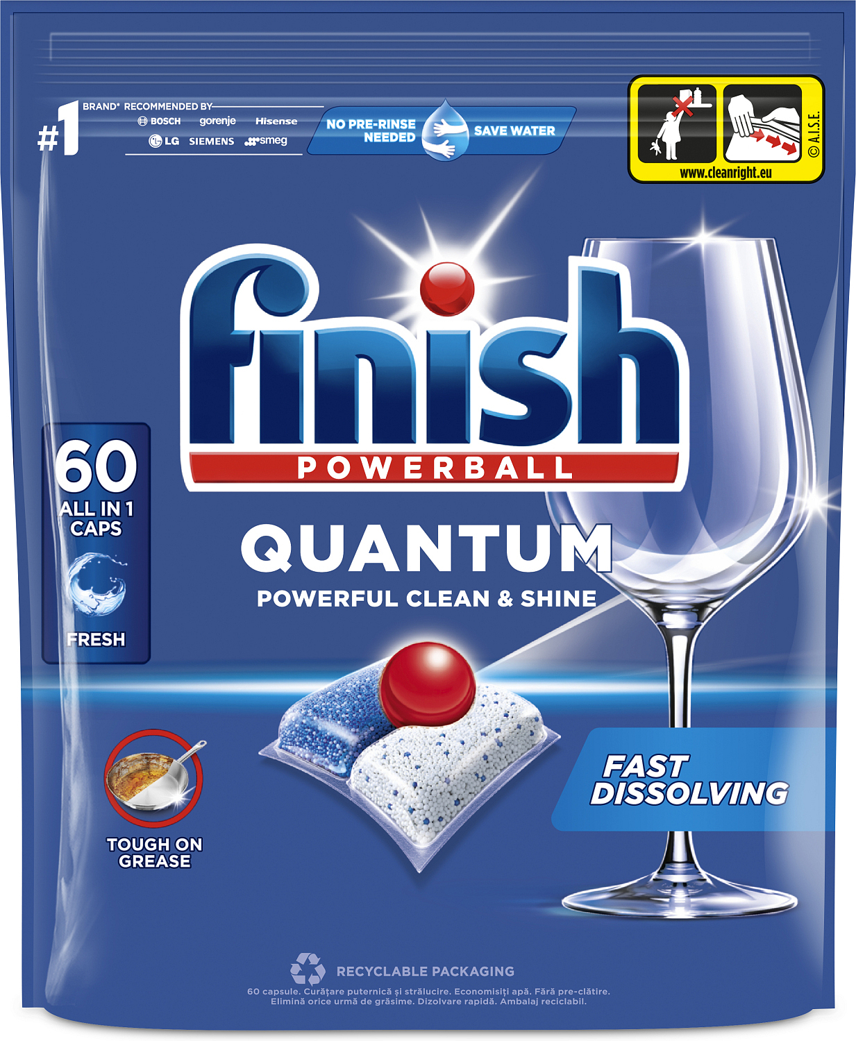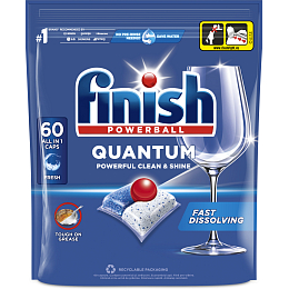 Finish Quantum All in 1 für absolute Sauberkeit und diamantartigen Glanz immer und sofort beim ersten Mal. Die dreikammerige Formulierung entfernt alle Arten von Verschmutzungen, die von Lebensmitteln stammen - sogar ohne vorherige Spülung. Die Marke Finish verpflichtet sich zum Schutz der Wasserressourcen, und daher arbeiten wir daran, den ökologischen Fußabdruck, den unsere Produkte und deren Verpackung hinterlassen, zu minimieren.