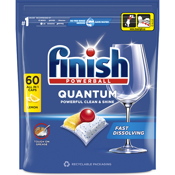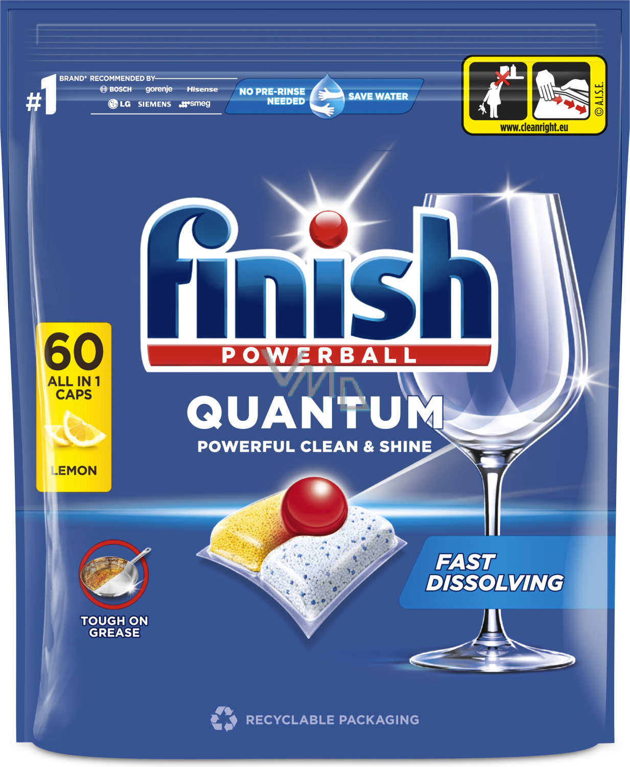 Die Kapseln bieten auch einen effektiven Schutz für den Geschirrspüler, den Filter und verhindern die Bildung von Kalk. Sie entfernen auch Rückstände von angebranntem Essen und verleihen dem Geschirr strahlenden Glanz ohne Streifen. Finish Quantum Ultimate funktioniert auch bei niedrigen Temperaturen.