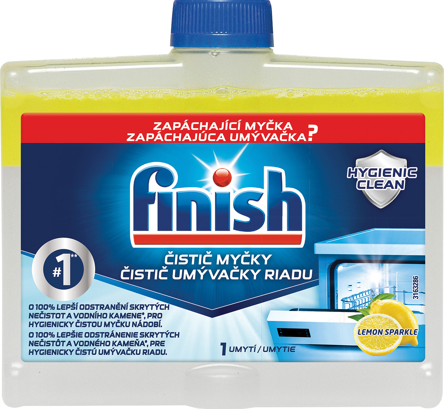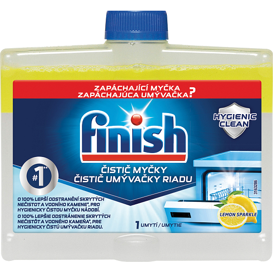 Finish Geschirrspülerreiniger Lemon Sparkle. Tag für Tag bilden sich im Filter, in der Düse und in den Rohren Ihrer Spülmaschine Kalk und Fettablagerungen. Mit dem Produkt Finish Geschirrspülerreiniger sorgen Sie für bis zu 100 % bessere Reinigung von Fett und Kalk im Vergleich zur Verwendung nur von Finish All in 1 Max Tabs, 65 °C Universalprogramm, Wasserhärte 16° dH.