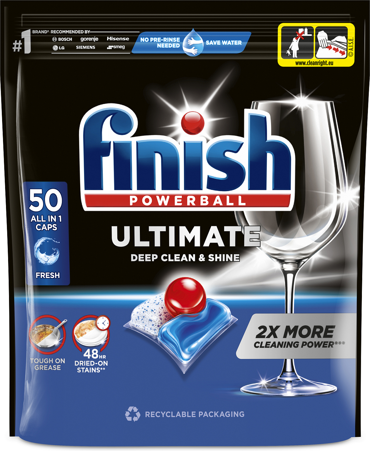 Finish Ultimate sind Gel-Tabletten für Geschirrspüler, die von führenden Geschirrspülerherstellern empfohlen werden. Sie entfernen effektiv Schmutz, Flecken (Kaffee und Tee), Ablagerungen und sorgen gleichzeitig für den Glanz von Besteck und silbernen Geschirrteilen.