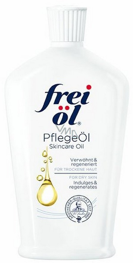 Pečující olej značky frei öl® je jedničkou mezi pěstícími oleji v oblasti německé farmacie. Tento jemný olej s obsahem cenných přírodních olejů a vitaminů hýčká suchou pokožku a je natolik účinný, že redukuje a zjemňuje i jizvy, strie a nežádoucí pigmentaci. Propůjčuje pokožce jedinečný pocit hladkosti a pružnosti.