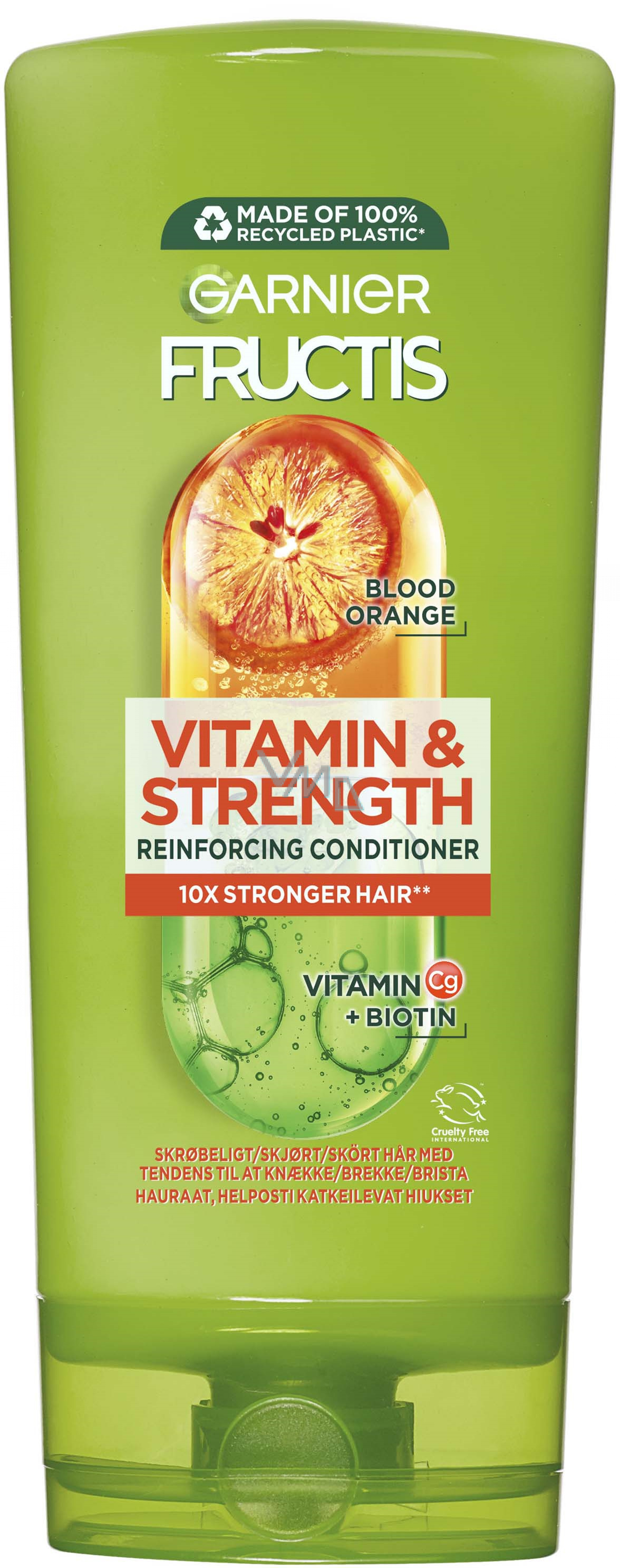 Fructis kondicionér na vlasy Vitamin & Strength je vhodný pro posílení vlasů. Obsahuje výtažky ze superovoce a účinné aktivní ingredience: červený pomeranč: ovoce s jednou z nejvyšších koncentrací vitaminů a multivitaminový komplex, derivát vitaminu C a biotin. Pro až 10x silnější vlasy!
