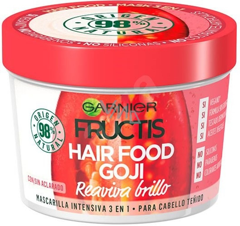 Skoncujte s vlasy poškozenými barvením jednou pro vždy s Garnier Fructis Goji Hair Food. Maska na vlasy Garnier Hair Food s přídavkem goji a rostlinných olejů účinně a šetrně pečuje o barvené vlasy a navrací jim původní zářivou barvu. Garnier Fructis Goji obsahuje 98 % přírodních látek a je zcela bez obsahu parabenů, silikonu a umělých barviv. S maskou Hair Food poznáte sílu goji na vlastní vlasy a získáte zpět jejich ztracenou vitalitu.