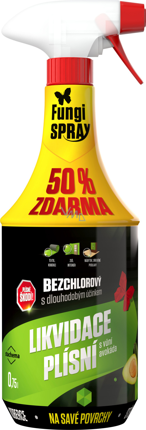 Schimmel vorher nicht entfernen! Besprühen Sie die befallenen Stellen aus einem Abstand von ca. 10 cm und entfernen Sie den Schimmel nach 24 Stunden Einwirkzeit mechanisch feucht (mit einer Bürste oder einem in dieses Mittel getauchten Tuch). Bei starkem Schimmelbefall muss der Vorgang wiederholt werden. Bei Kontakt mit lackierten Oberflächen vorher an einer kleinen, eventuell versteckten Stelle testen. Auf gereinigte, desinfizierte und trockene Oberfläche von Baumaterialien wenden Sie das chlorfreie Schimmelmittel FungiSAN mit präventiver Wirkung gegen Schimmel an, Hersteller STACHEMA CZ. Bei Anwendung des Mittels auf Textil oder anderen Materialien, die mit der Haut in Kontakt kommen können, ist nach der Behandlung eine gründliche Wäsche und Reinigung der behandelten Materialien erforderlich (Entfernung von Resten des Mittels).