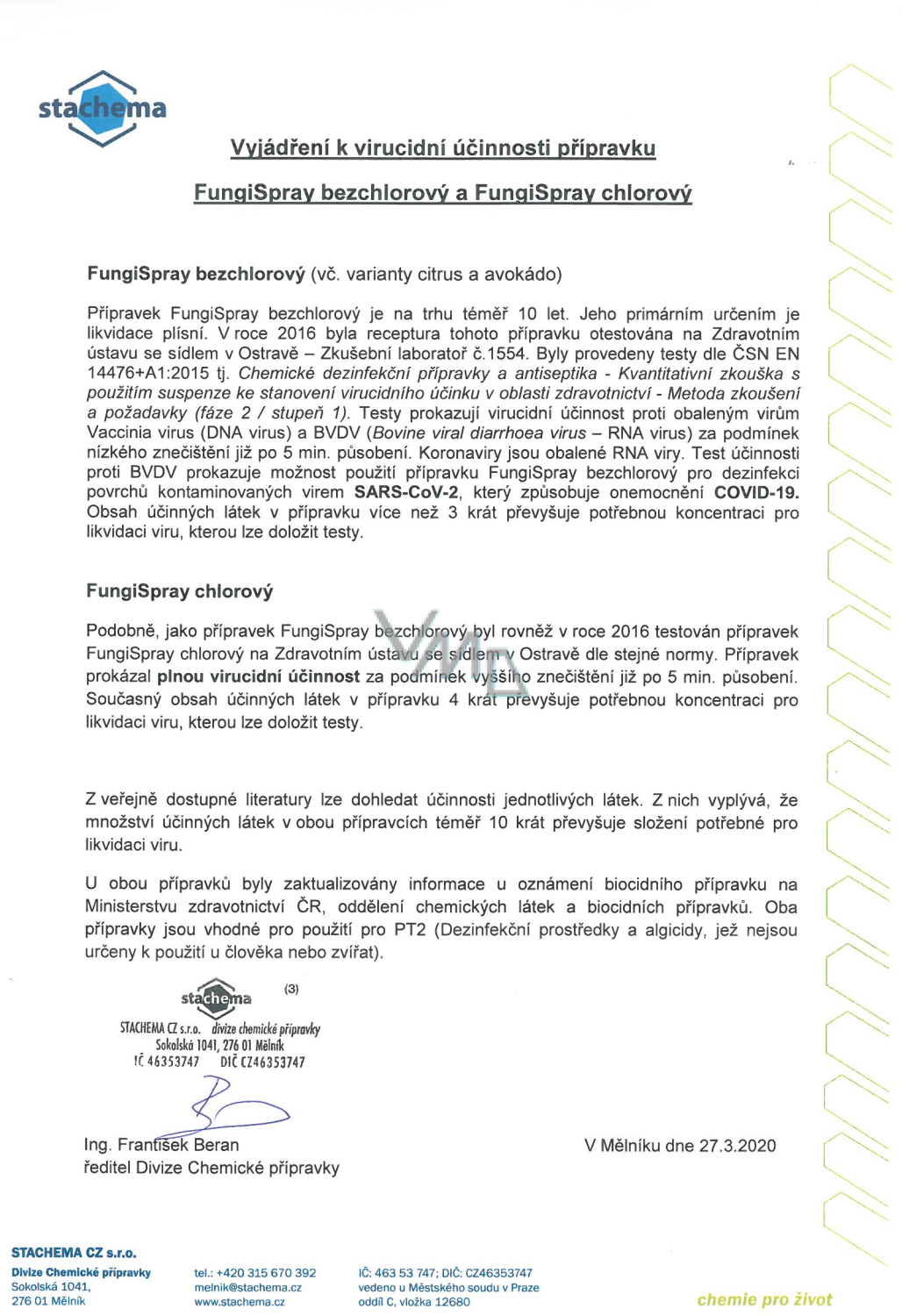 Vyiádření k virucidní účinnosti přípravku FungiSpray bezchlorový a FungiSpray chlorový:
