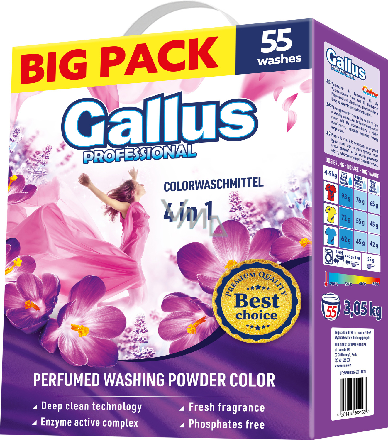 Universelles Waschpulver mit hervorragendem Preis-Leistungs-Verhältnis. Es ist geeignet für standardfarbige Wäsche. Es entfernt effektiv Flecken und Verunreinigungen aus dem Stoff bei klassischen Temperaturen von 30 bis 60 °C. Es ist für alle Waschmaschinentypen geeignet und schützt vor der Bildung von Kalk.