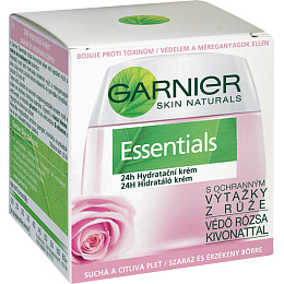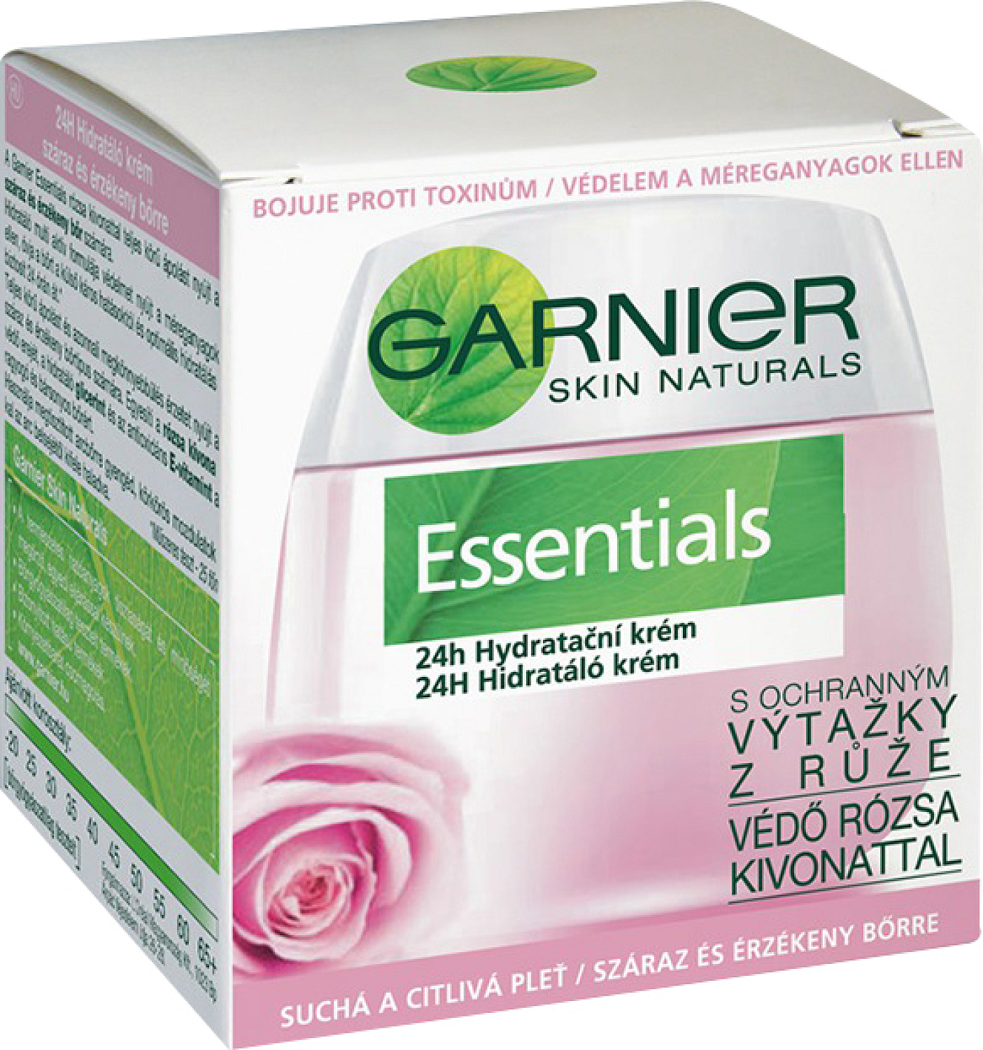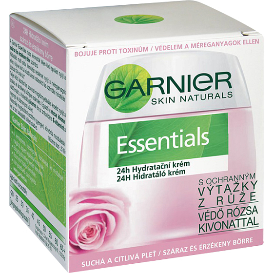 Garnier Essentials je určen pro kompletní hydratační péči suché a citlivé pleti. Hydratační multi-aktivní složení bojuje proti toxinům, chrání pleť před každodenními nepříznivými vlivy a zajišťuje optimální hydrataci po dobu 24h. Složení obohacené o růžovou vodu, známou pro své zklidňující účinky, redukuje pnutí pokožky, hydratuje pleť a obnovuje hebkost a pružnost.