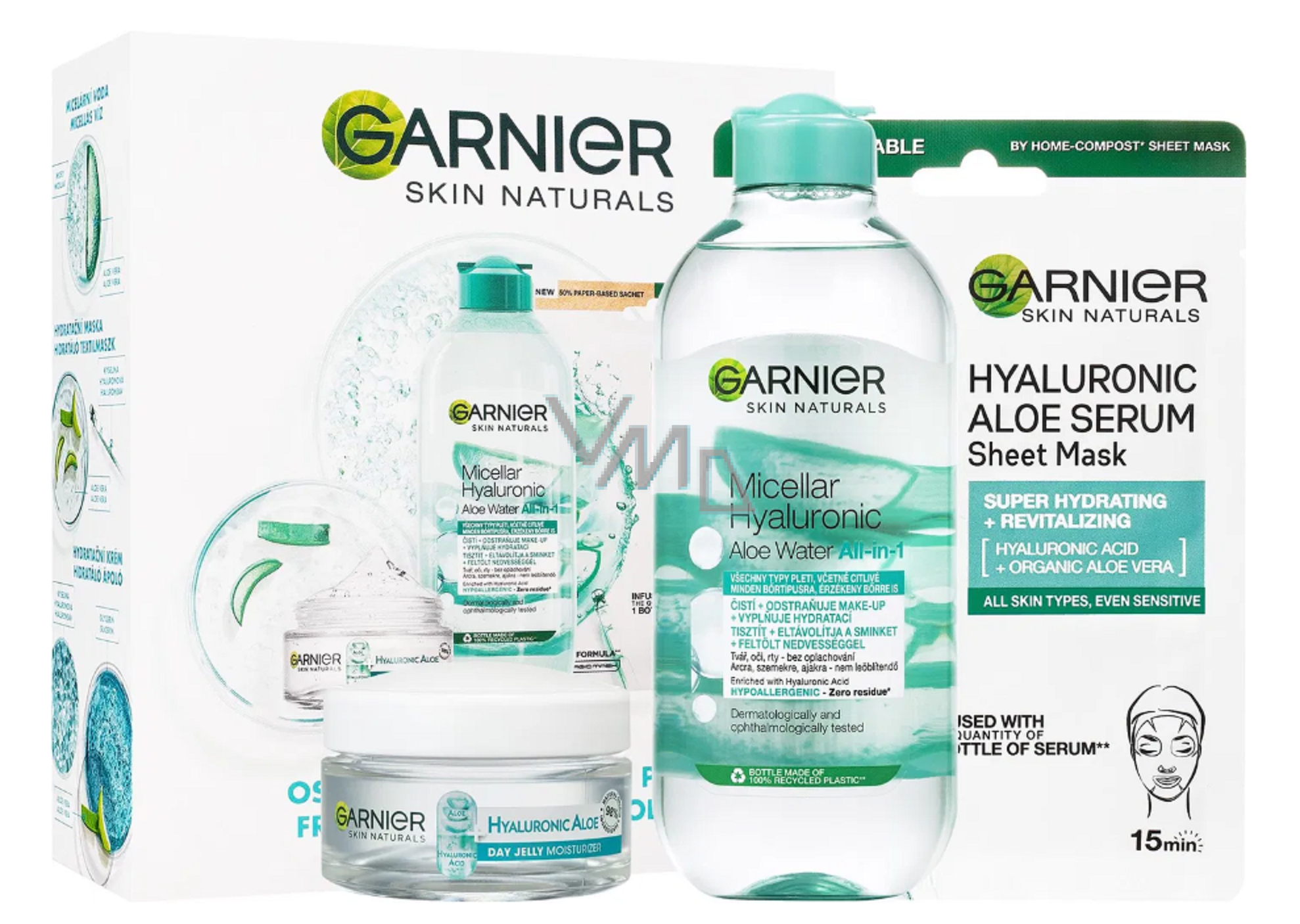 Garnier Hyaluronic Aloe Mizellenwasser + Tagesgesichtsserum + revitalisierende Tuchmaske, Kosmetikset für Frauen