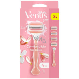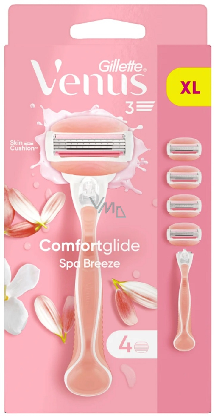 Holicí strojky Venus ComfortGlide Spa Breeze se dokonale přizpůsobí křivkám těla. Výkyvná hlavice je vybavena třemi ostrými břity, kterým neuteče žádný chloupek, a lubrikačním proužkem. Ten je napuštěn pečujícím máslem, které se uvolňuje do pokožky během holení. Navíc ji provoní vůní bílého čaje. Hlavice strojku lze použít na jakoukoliv rukojeť strojků GILLETTE Venus.