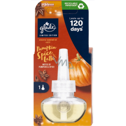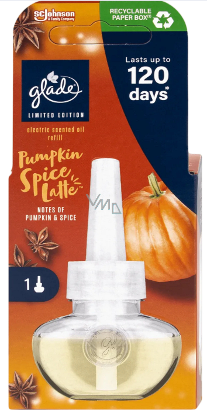 Ersatzfüllung Glade für den elektrischen Lufterfrischer Pumpkin Spice Latte mit dem Duft von frisch zubereitetem Kürbis-Latte. Sie können die Duftintensität bei diesem Typ Lufterfrischer nach Ihren Wünschen regulieren. Füllt jeden Raum wunderschön mit einem angenehmen Aroma.