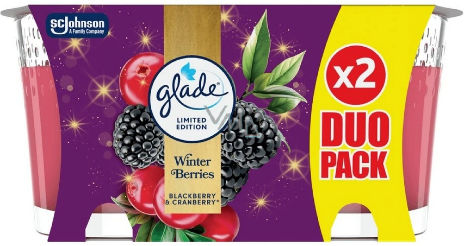 Glade Winter Berries je limitovaná edice vonné svíčky, která přináší do vašeho domova sváteční atmosféru díky sladké a ovocné vůni zimních bobulí. Balení obsahuje dvě skleněné svíčky o hmotnosti 112 g každá, což je ideální pro dlouhotrvající provonění místnosti.