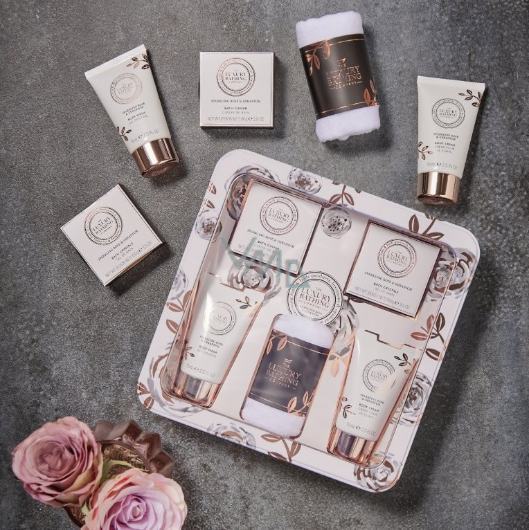 Grace Cole Rose & Geranium Duschgel 75 ml + Körpercreme 75 ml + Badeperlen 80 g + Badesalz 100 g + Flanelltuch + Dose, Kosmetikset für Frauen