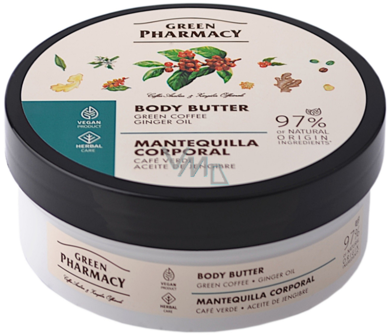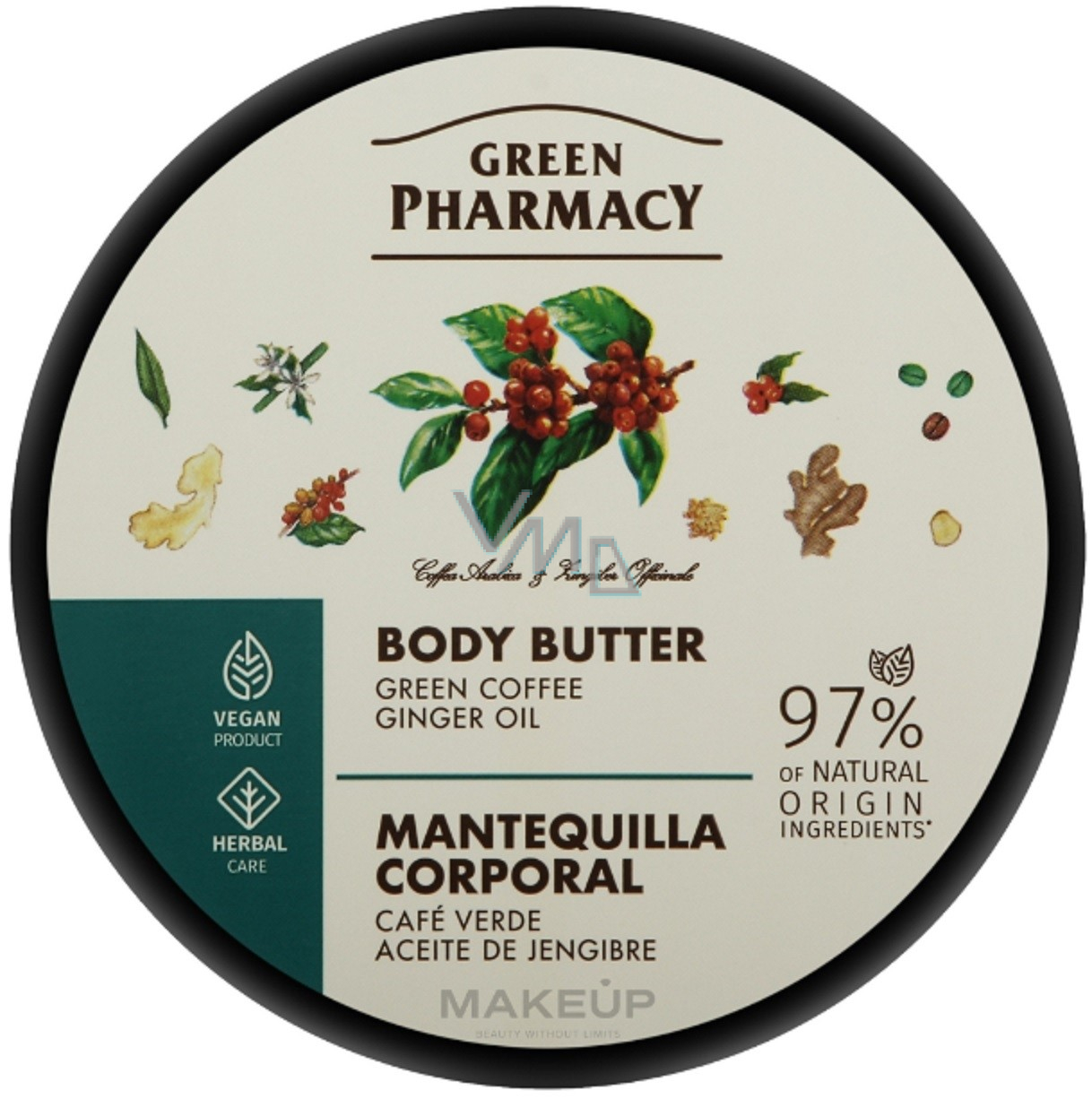 Tělové máslo Green Pharmacy Body Butter se zelenou kávou a zázvorovým olejem pomáhá zlepšit a uzdravit Vaši pokožku. Extrakt ze zelené kávy pokožku tonizuje a dodává jí pružnost a mladistvost, zároveň pomáhá v boji s celulitidou. Je ideální pro ty, kteří hledají osvěžující a oživující péči. Kombinace aktivních látek poskytuje revitalizaci a hydrataci, zanechávají pokožku hebkou, jemnou a osvěženou. Máslo bylo vyvinuto s důrazem na přírodní ingredience, které tvoří 97 % obsahu produktu, a jejich výživné vlastnosti.