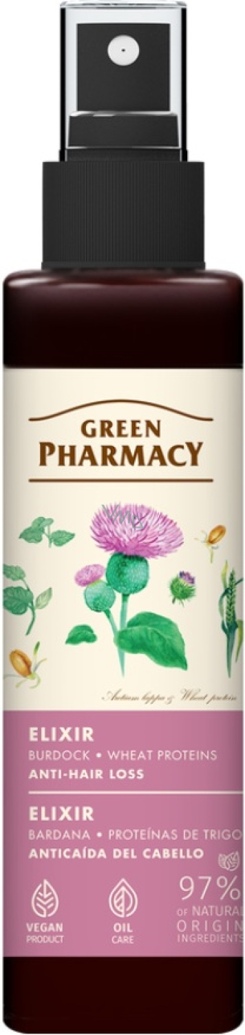 Elixír proti vypadávání vlasů od značky Green PharMacy je bezoplachová vlasová péče obohacená o přírodní výtažky z Lopuchu a pšeničných proteinů. Tento produkt je navržen tak, aby posiloval vlasy od kořínků až po konečky, zlepšoval jejich strukturu a vzhled, a zároveň stimuloval růst nových vlasů. Je vhodný pro všechny typy vlasů a neobsahuje Parabeny ani Silikony.