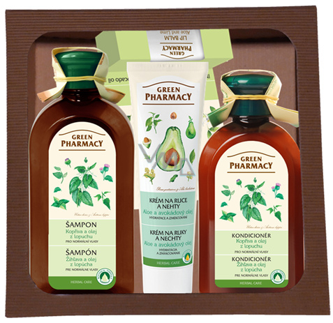 Green Pharmacy Brennnessel- und Klettenwurzelöl-Shampoo für normales Haar 350 ml für Frauen + Haarspülung 300 ml + Aloe- und Avocadoöl-Feuchtigkeitscreme für Hände und Nägel 100 ml + Lippenbalsam 3,6 g, Kosmetikset