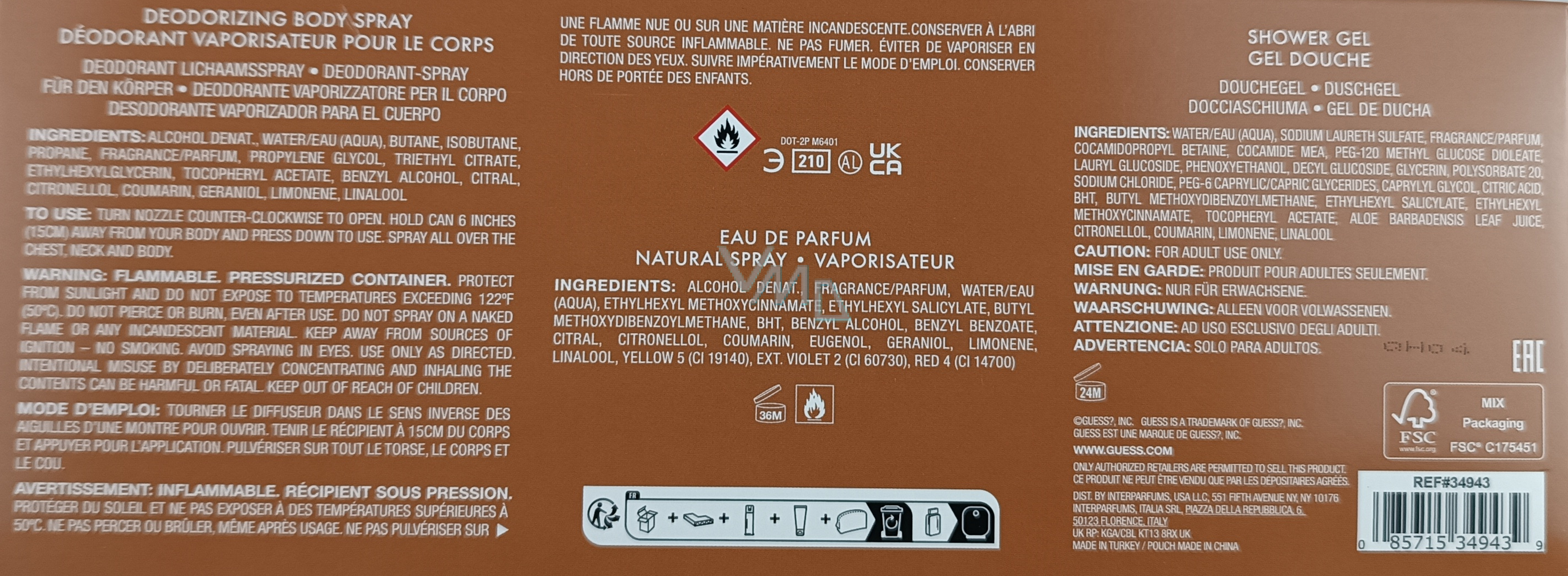 Alcohol Denat., Fragrance/Parfum, Water/Eau (Aqua), Ethylhexyl Methoxycinnamate, Ethylhexyl Salicylate, Butyl Methoxydibenzoylmethane, BHT, Benzyl Alcohol, Benzyl Benzoate, Citral, Citronellol, Coumarin, Eugenol, Geraniol, Limonene, Linalool, Yellow 5 (CI 19140), Ext. Violet 2 (CI 60730), RED 4 (CI 14700)