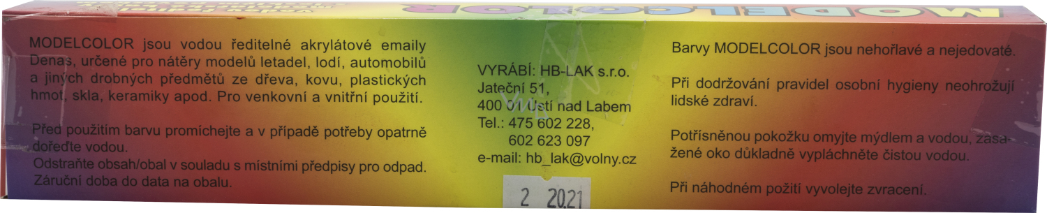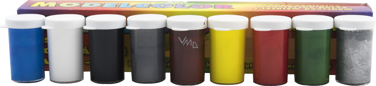 Modelcolor ist ein Set von wasserverdünnbaren Deckfarben in den Farbtönen Blau, Weiß, Schwarz, Grau, Braun, Gelb, Rot, Grün und Aluminium. Sie enthalten eine Acrylatdispersion und lichtechte Pigmente, feine Füllstoffe, Biocidmittel, Koaleszenzmittel und weitere Zusätze zur Modifikation ihrer Eigenschaften. Das Verdünnungsmittel ist Wasser, es enthält keine Lösungsmittel. Verpackung 9× 20 g.