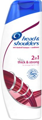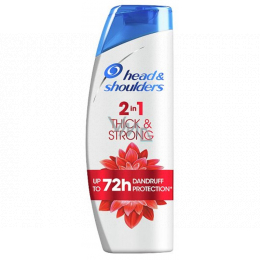 Head & Shoulders Šampon a balzám na vlasy proti lupům 2v1 bojuje proti příčinám vzniku lupů pro až 72hodinovou ochranu proti lupům, svědivosti a suché pokožce hlavy (viditelné lupy, při pravidelném používání; svědivost v důsledku výskytu lupů). Jeho pokrokové složení s vyváženým pH a posílené antioxidanty je dermatologicky testované pro šetrnou péči o vlasy a pokožku hlavy a poskytuje vlasy až 100% bez lupů, klinicky ověřené (při pravidelném používání). Šampon a balzám proti lupům Thick & Strong pomáhá posilovat vlasy a obnovovat jejich pevnost od kořínků až po konečky (proti poškození a lámavosti způsobené česáním). Head & Shoulders je světová jednička mezi značkami šamponů (na základě výpočtu společnosti P&G založeném na údajích o ročních prodejích šamponů), která se stará o planetu: Recyklovatelná lahev (s výjimkou víčka a v závislosti na vybavení recyklační továrny).