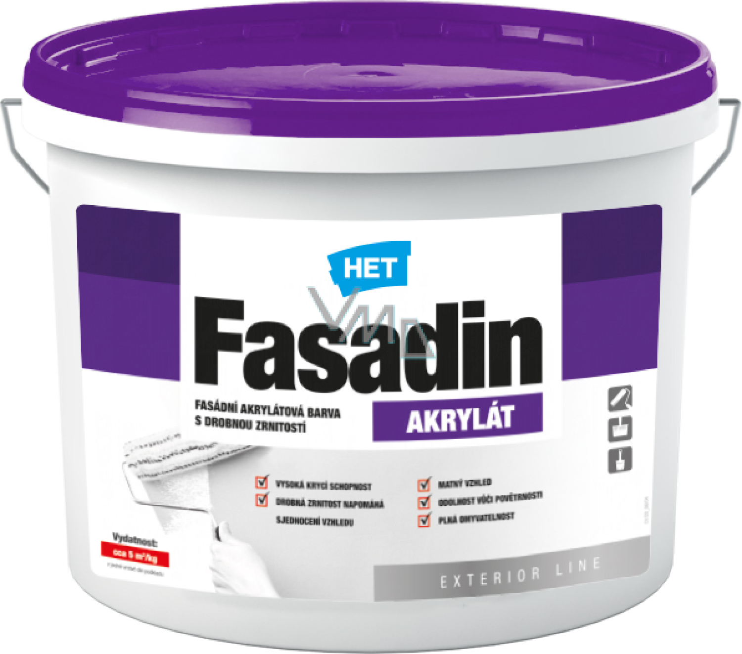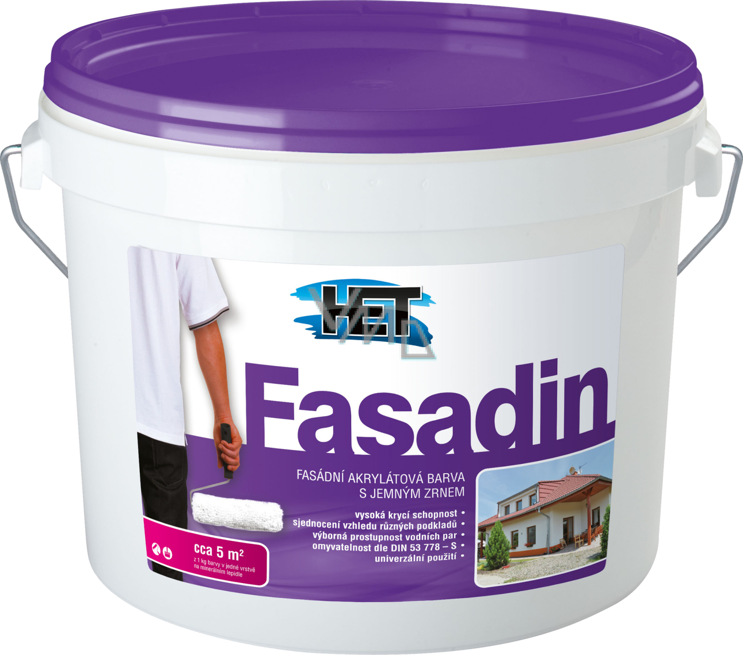 Het Fasadin ist eine Fassadenfarbe für Außenanstriche von Kalk-, Kalkzement- und Břízolitputzen, Putzen mit Acrylatbindemittel, Mauerwerk, für dekorative Anstriche von vertikalen Betonbauwerken usw. Der Anstrich erzeugt eine matte, feinkörnige, dampfdurchlässige, vollständig abwaschbare Oberfläche, die wetterbeständig, gegen sauren Regen und industrielle Emissionen resistent ist.
