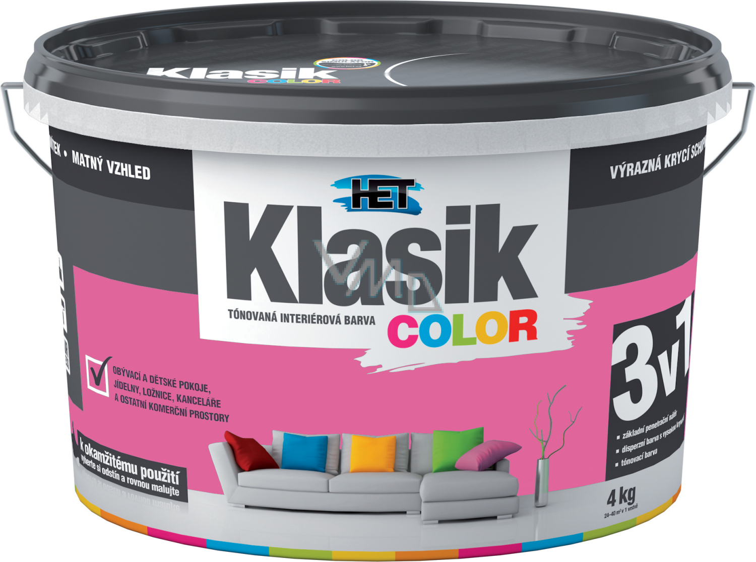 Het Klasic Color malířská tónovaná disperzní otěruvzdorná barva kterou doporučujeme pro obývací a komerční prostory, dětské pokoje, jídelny, chodby, kanceláře, prodejní prostory. Vhodná k nátěrům minerálních, sádrových a sanačních omítek, zdiva, betonových panelů a monolitů, sádrokartonových, sádrovláknitých a dřevovláknitých desek, papírových tapet k tomu určených, tapet ze skelných vláken apod.