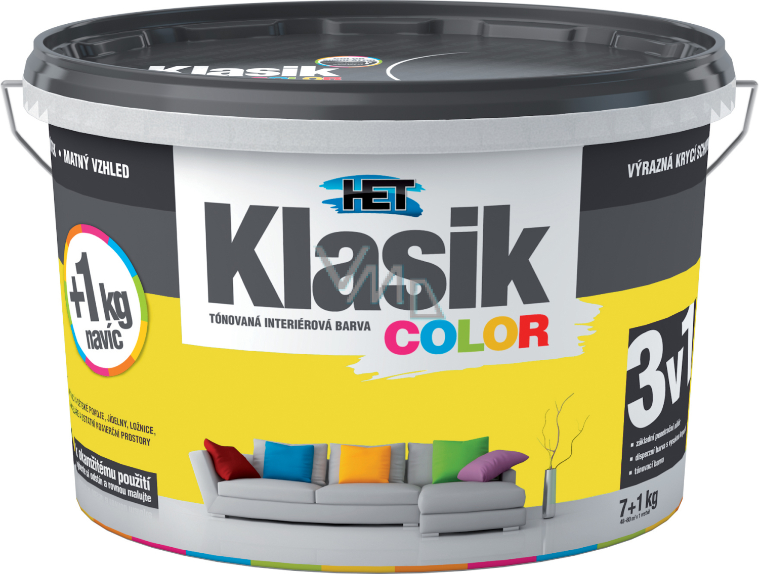 Het Klasic Color malířská tónovaná disperzní otěruvzdorná barva kterou doporučujeme pro obývací a komerční prostory, dětské pokoje, jídelny, chodby, kanceláře, prodejní prostory. Vhodná k nátěrům minerálních, sádrových a sanačních omítek, zdiva, betonových panelů a monolitů, sádrokartonových, sádrovláknitých a dřevovláknitých desek, papírových tapet k tomu určených, tapet ze skelných vláken apod.