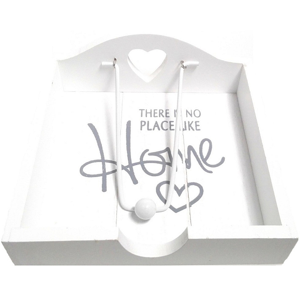 Proměňte Váš stůl nebo kuchyňskou linku v nevšední místo, pomocí dřevěného držáku na ubrousky. Držák v bílé barvě s vyřezaným srdíčkem a s nápisem There Is No Place Like Home.Udrží papírové ubrousky na svém místě.