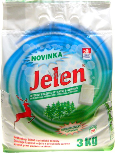 Mýdlový prášek JELEN je vysoce účinným pracím prostředkem s kousky jádrového mýdla, které zvyšují jeho prací sílu. Kromě mýdla je vyrobený z přírodních surovin a neobsahuje žádné syntetické látky. Díky tomu je velmi šetrný k pokožce a určený pro lidi i s velmi citlivou pokožkou, je ekologický, vhodný pro alergiky i děti již od 3 let. Jedinečný mýdlový prášek JELEN dokonale vypere prádlo pro celou vaší rodinu.