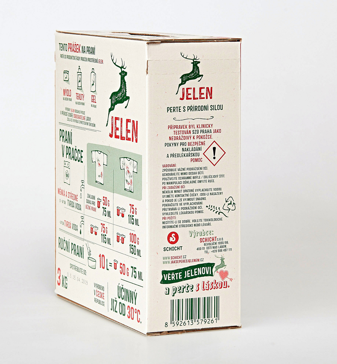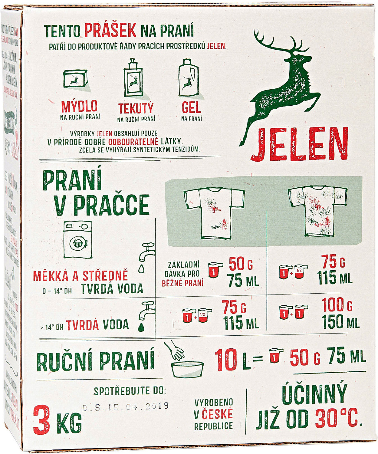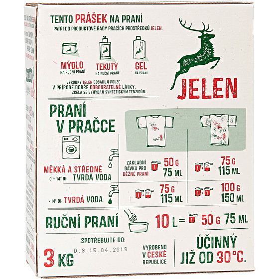 Es enthält ausschließlich natürliche Stoffe, die sich im Wasser schnell, vollständig und natürlich ökologisch abbauen. Es enthält keine synthetischen Stoffe, allergenen Parfümstoffe, künstliche Farbstoffe, Bleichmittel oder Phosphate, dafür aber einen hohen Anteil an echter Seife, die aus Fetten hergestellt wird. Jahre haben gezeigt, dass Jelen ein zuverlässiger Helfer gegen die hartnäckigsten Verschmutzungen und Flecken ist, beispielsweise von Kirschen oder Schokolade, die Kinder heimlich im Bett essen. Jelen wäscht farbige und weiße Wäsche gut. Reicht für 60 Wäschen.