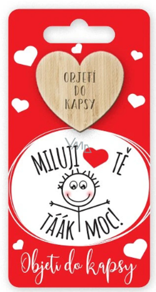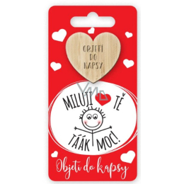 Štěstíčko ve tvaru srdce, to je drobný dárek pro velkou radost. Kapesní objetí je malý a milý dárek darovaný od srdce, který udělá velkou radost. Dřevěný symbol ve tvaru srdce s textem "objetí do kapsy" slouží jako štěstíčko. Na kartičce najdete milý text "Miluji Tě táák moc!".