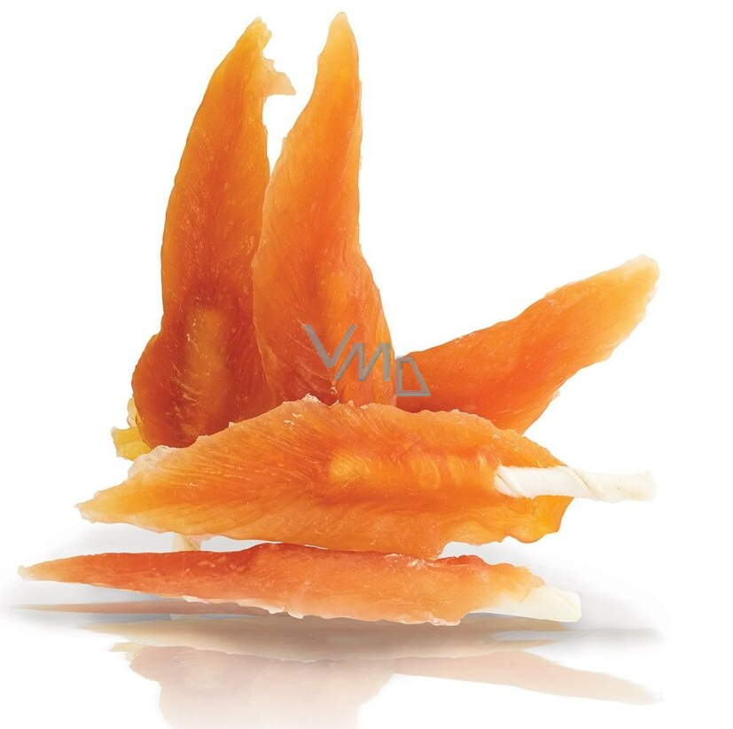 Měkká masová pochoutka pro psy - kuřecí prsa na buvolí tyčince. Slouží jako odměna při hře, výcviku nebo jako doplněk stravy při cestách.