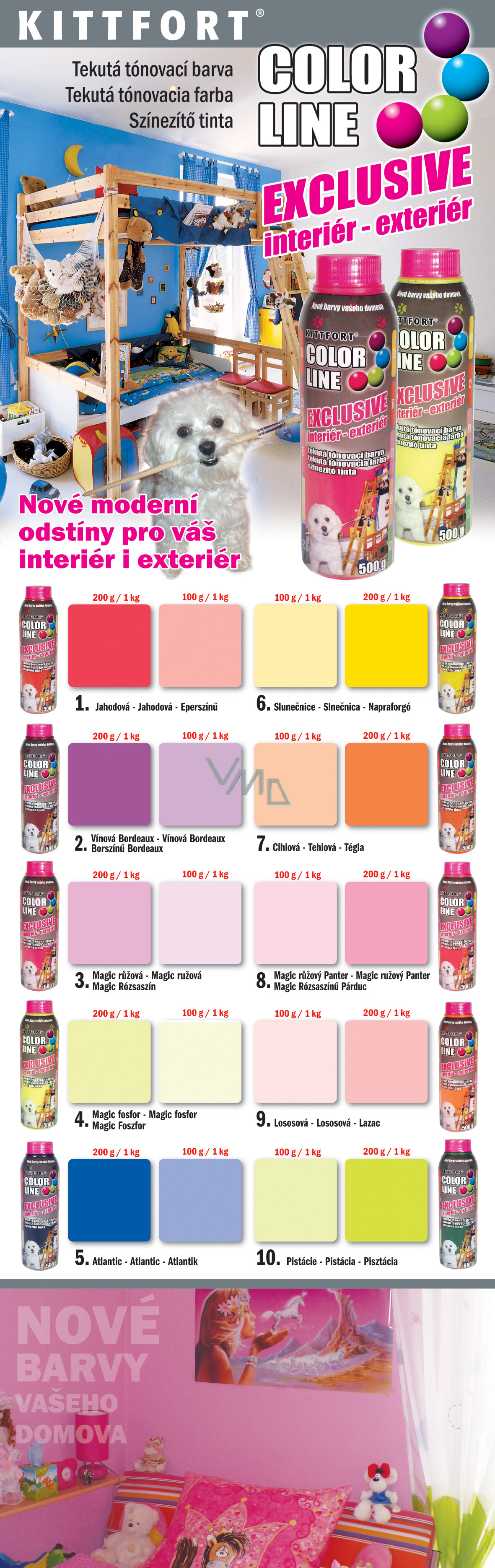 Tónovací barva Color Line Exclusive je vyrobena ze světlostálých pigmentů a je určena k tónování všech malířských, disperzních, akrylátových a klihových barev pro vnitřní i vnější použití. Tónovací barva není určena pro tónování silikátových nátěrových hmot. S barvou v plném tónu je možné pracovat také, ale jen v interiérech a je nutné počítat s větším počtem nátěrů.