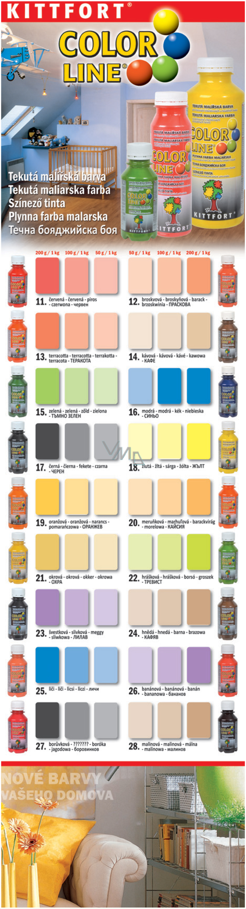 Tónovací barva Color Line je vyrobena ze světlostálých pigmentů a je určena k tónování všech malířských, disperzních, akrylátových a klihových barev pro vnitřní i vnější použití. S barvou v plném tónu je možné pracovat také, ale jen v interiérech a je nutné počítat s větším počtem nátěrů.