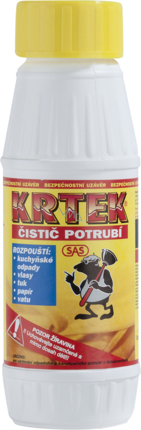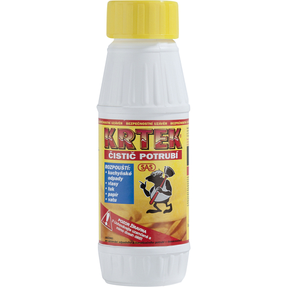 Der Abflussreiniger Krtek ist für die Pflege von Abwasser- und Kanalrohren in Haushalten bestimmt, wo er Küchenabfälle, Haare, Fett, Papier und Watte auflöst. Er darf nicht für Aluminiumrohre verwendet werden. Die Flasche ist mit einem Sicherheitsschraubverschluss versehen.