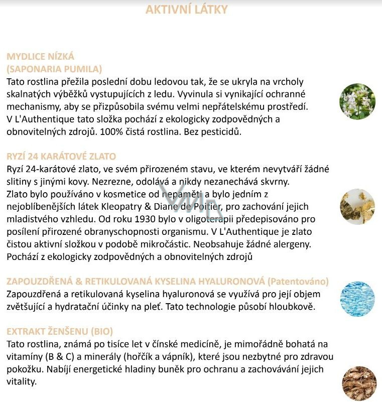 Reines 24-karätiges Gold, in seinem ursprünglichen Zustand, in dem es keine Legierungen mit anderen Metallen bildet. Es rostet nicht, ist widerstandsfähig und hinterlässt niemals Flecken. Gold wird seit jeher in der Kosmetik verwendet und war eines der beliebtesten Materialien von Cleopatra & Diane de Poitier zur Erhaltung ihres jugendlichen Aussehens. Seit 1930 wurde es in der Oligotherapie zur Stärkung der natürlichen Abwehrkräfte des Körpers verschrieben. In L'Authentique ist Gold ein reiner aktiver Inhaltsstoff in Form von Mikropartikeln. Es enthält keine Allergene. Es stammt aus ökologisch verantwortlichen und erneuerbaren Quellen.