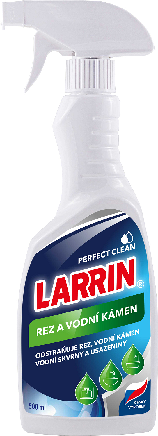 Larrin für Rost und Wasserstein mit Sprühkopf. Entfernt Rost, Wasserstein, kalk- und seifenablagerungen. Ist vorgesehen zur Reinigung von Badezimmern und anderen unempfindlichen, säurebeständigen Oberflächen, einschließlich Zubehör aus Edelstahl und Chrom.