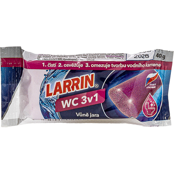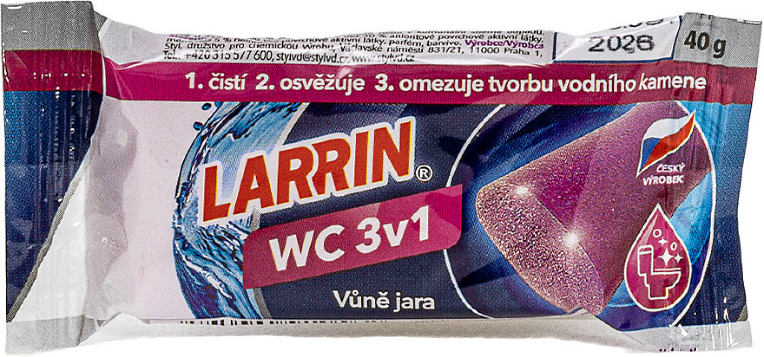 Reinigungs- und Desodorierungsmittel für WC-Schüsseln und sanitäre Einrichtungen. Feste Substanz von wachsartiger Beschaffenheit, die eine Mischung aus anionischen und nichtionischen Tensiden, Parfum mit Blumenaroma, Farbstoffen und Hilfsstoffen ist.