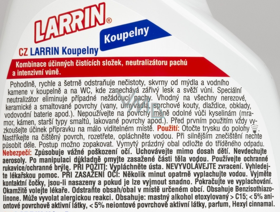 Larrin čistič koupelny s rozprašovačem 500ml. Moderní a účinný přípravek pro koupelny i WC. Bez námahy odstraňuje nečistoty včetně skvrn od vodního kamene. Zanechává na čištěném povrchu zářivý lesk a intenzivní svěží vůni. Obsahuje neutralizátor, který eliminuje případné nežádoucí pachy.